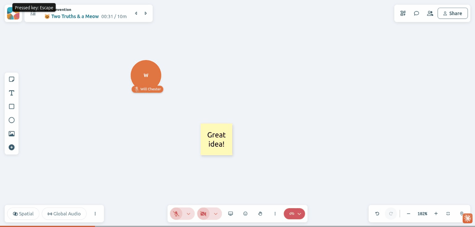"I'm switching us to spatial audio. You'll now hear people based on how close you are to them on the canvas. Move closer to someone to hear them better."